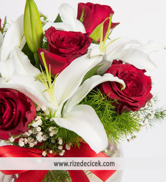 Onu size aşık edecek sihirli bir formülümüz var. Küre cam vazoda 5 adet kırmızı gül ve 3 adet beyaz lilyum ile tasarlanmış Kırmızı gül ve lilyum eşsiz bir aranjman.