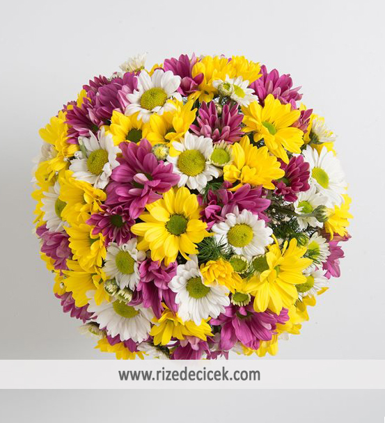 Koyu pembe, beyaz ve sarı en güzel buluşmasını yaptı. Rengarenk Papatya Aranjmanı, bahar çiçeklerinin mis kokusunu sizlerle buluşturuyor.
